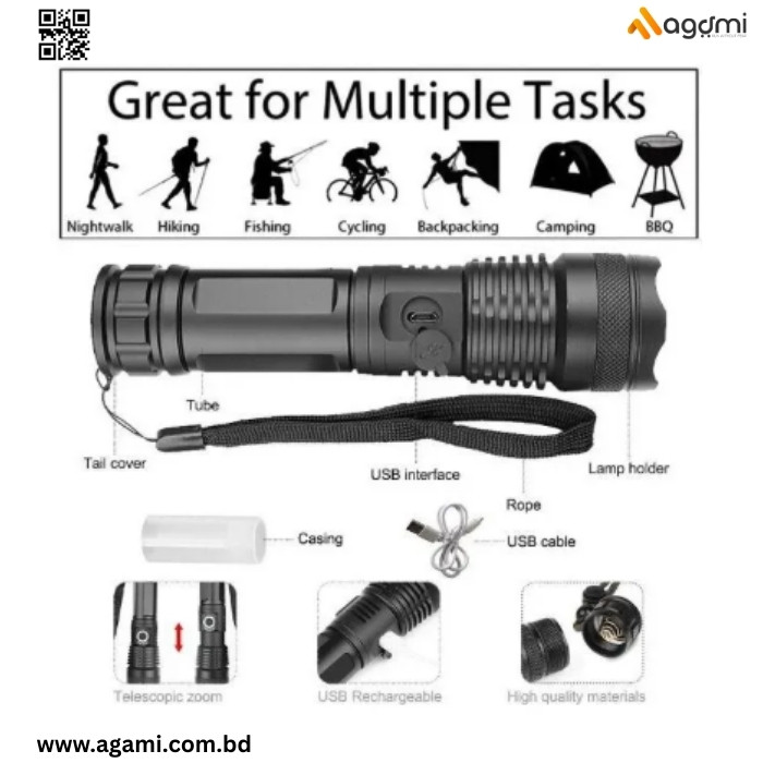 পরিসীমা: 300-500 মিটার• জুম মোড: টেলিস্কোপিক জুম• সুইচ মোড: 5 মোড (উচ্চ - মাঝারি - নিম্ন - SOS - ফ্ল্যাশ)• ব্যাটারির ধরন: 18650, 5500mAh, 3.7V li-ion• আলোর সময়: 2-6 ঘন্টা • ওয়াটারপ্রুফ লেভেল: IPX-6• শরীরের রঙ: কালো• উপাদান: T6063-T6 এভিয়েশন অ্যালুমিনিয়াম• সাইজ: 16.8cm * 4cm * 3.3cm• টর্চ নেট ওজন: 0.207kg• রিচার্জেবল: কম্পিউটার USB, কার USB, USB এর জন্য মাইক্রো USB চার্জিং প্লাগ এবং ব্যাটারি * আকার: 7.5" পণ্য বৈশিষ্ট্য